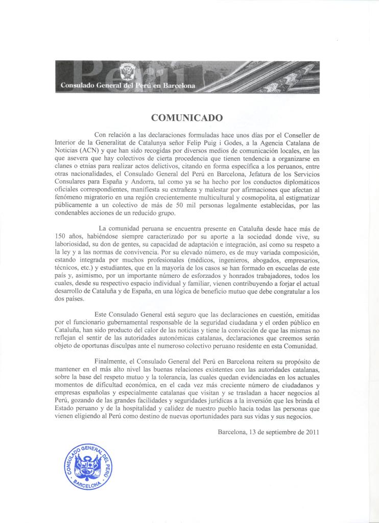 Hace bien el Consulado de Perú en Barcelona, en pronunciarse al respecto, en cumplimiento de sus funciones; hacia mucho que no se adoptaba una postura firme en este sentido , por lo que nos congratulamos, esperanzamos que a partir de este hecho la actuación diplomática sea firme en resguardo de los derechos y la dignidad de los inmigrantes peruanos.