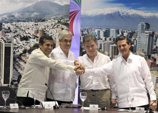 Colombia, Chile, México y Perú firmaron el lunes un acuerdo que elimina de inmediato los aranceles al 92 por ciento de sus productos para aumentar el intercambio comercial y conquistar conjuntamente los mercados de la región Asia-Pacífico, aumentando las exportaciones y atrayendo inversión extranjera. Imagen de los presidentes de los cuatro países al firmar el acuerdo en la ciudad colombiana de Cartagena el 10 de febrero.