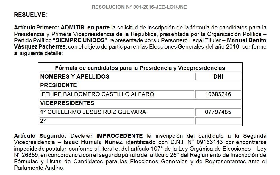 La decisión fue adoptada esta tarde por el Jurado Electoral Especial de Lima Centro, tras admitir a trámite la solicitud de inscripción de la fórmula presidencial de la citada agrupación política.