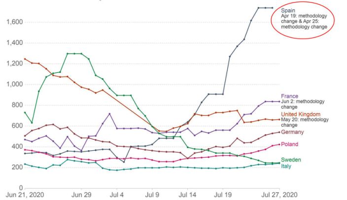 Los nuevos rebrotes en España confirman la transmisión comunitaria y vuelven a poner al país a la cabeza de los focos de contagio | datos Our world in data