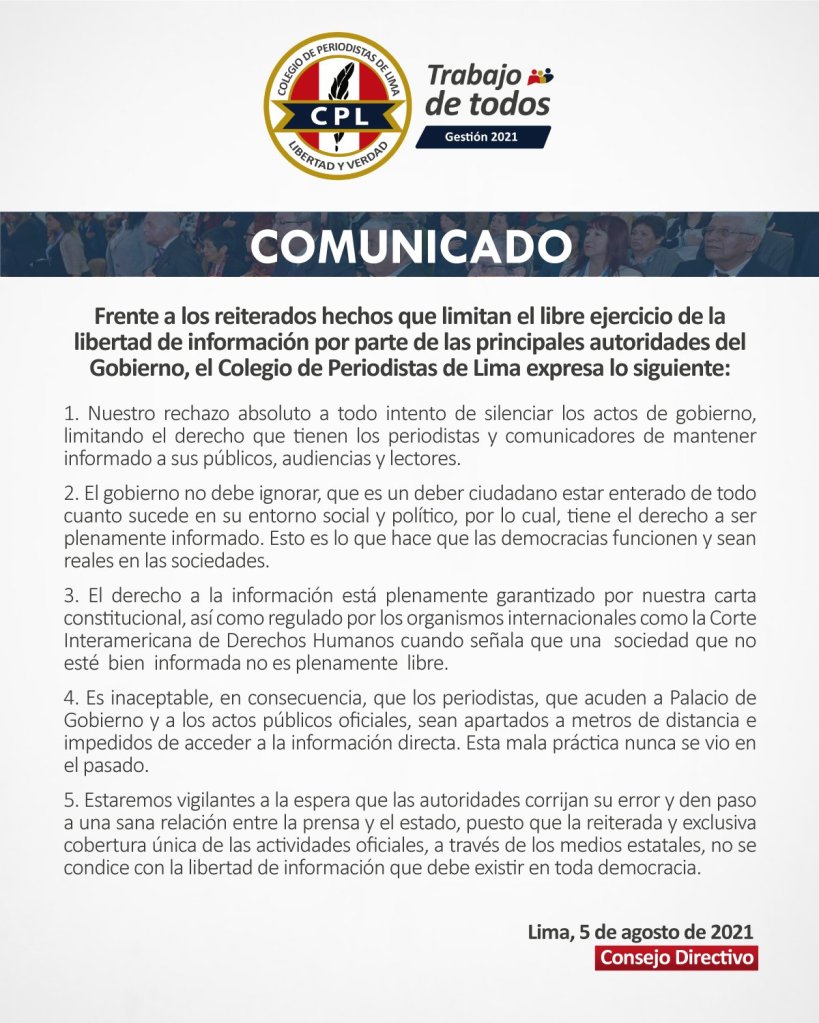 El Gobierno impidió nuevamente, este jueves, la cobertura informativa de periodistas y comunicadores en la ceremonia de reconocimiento del presidente #Pedrocastillo como Jefe Supremo de las Fuerzas Armadas y la @PoliciaPeru. El CPL rechaza esta actitud.