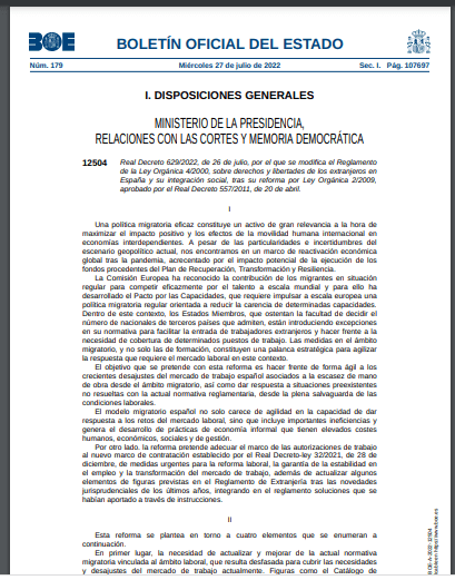 Real Decreto 629/2022, de 26 de julio, por el que se modifica el Reglamento de la Ley Orgánica 4/2000, sobre derechos y libertades de los extranjeros en España y su integración social, tras su reforma por Ley Orgánica 2/2009, aprobado por el Real Decreto 557/2011, de 20 de abril.
