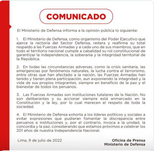 Tras remarcar que los militares «no son deliberantes y su accionar siempre está enmarcado en la Constitución y la ley, por lo cual merecen el respeto de toda la sociedad», exhortó «a los líderes políticos y sociales a evitar expresiones que pudieran fomentar la discrepancia entre peruanos e instituciones y, por el contrario, invoca a la unidad, la concordia y la paz».